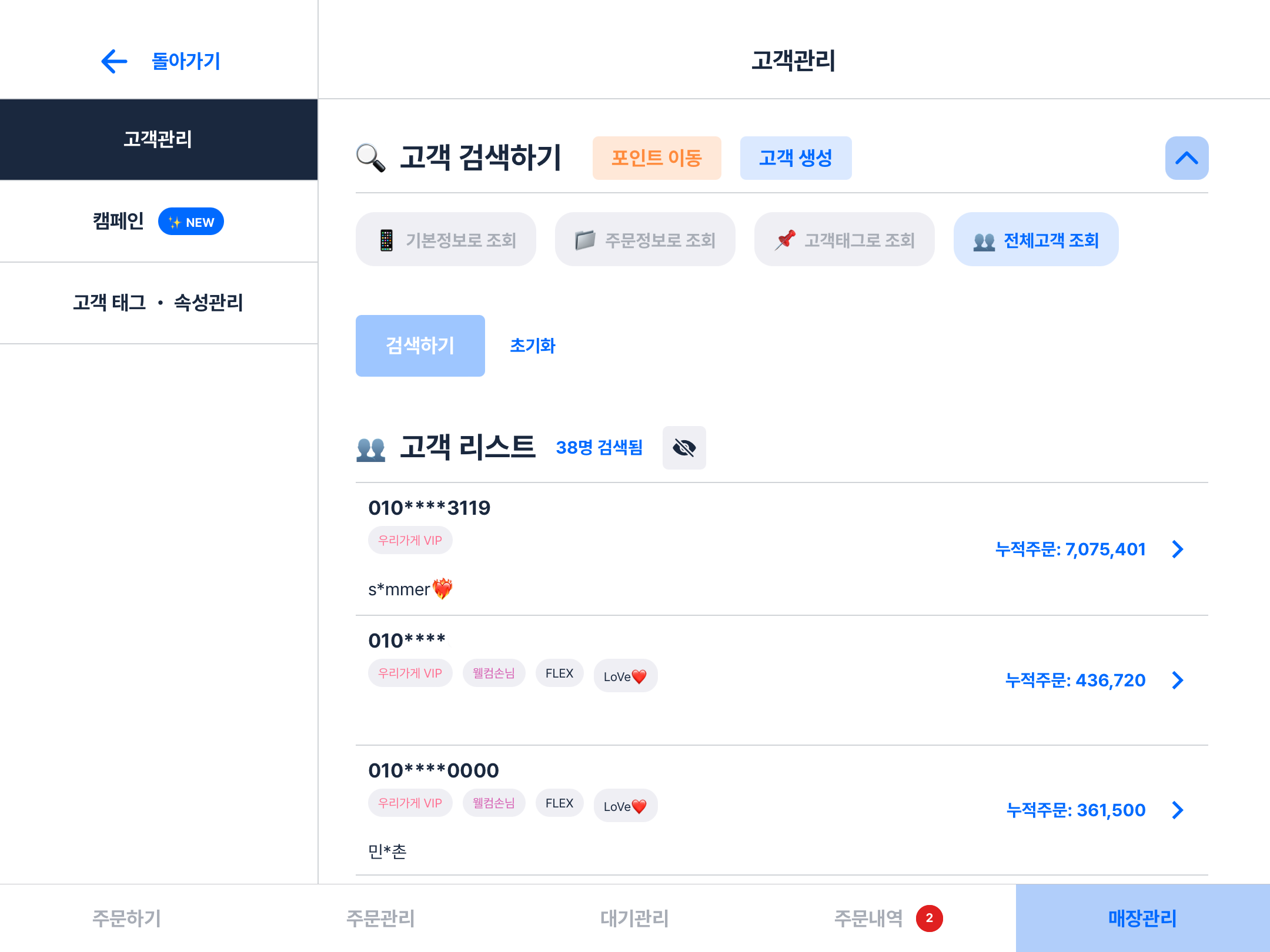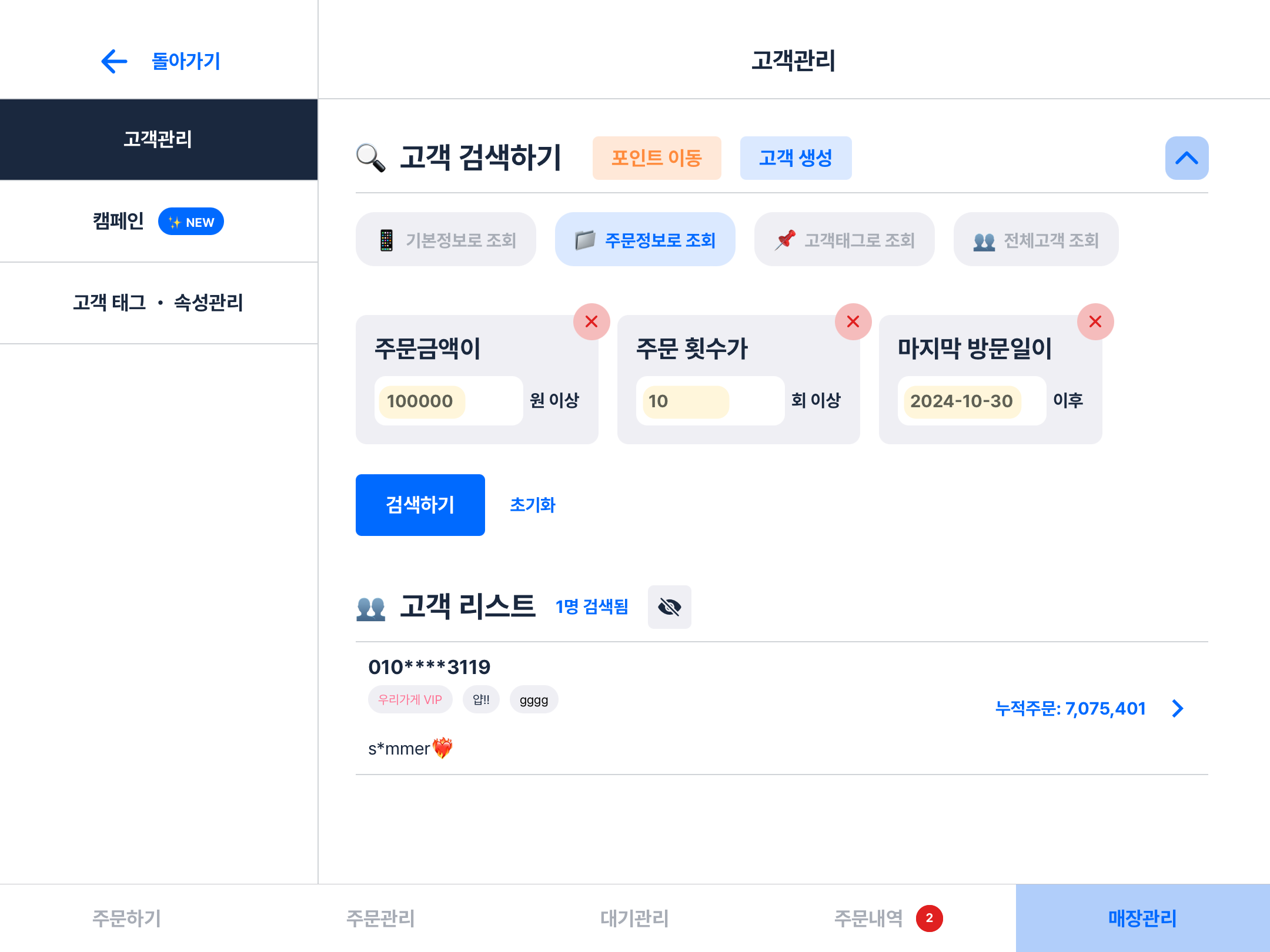 매장에 방문한 고객의 정보를 검색하실 수 있으며, 고객의 주문데이터를 기반하여 조건별 검색이 가능합니다.