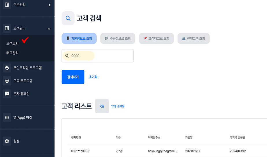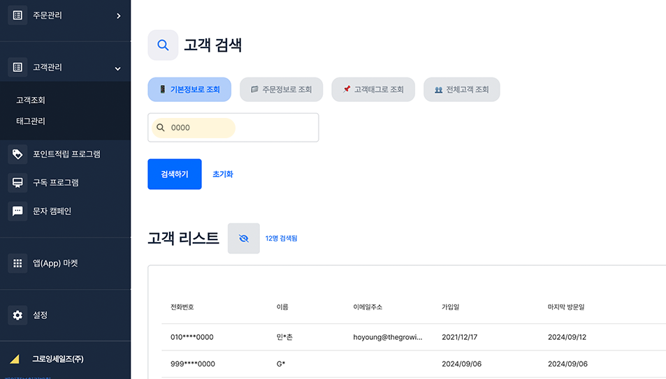 step 1. 그로잉세일즈 대시보드에서 \[**고객관리 > 고객조회 > 고객 검색**]을 통해 삭제를 원하는 고객을 확인해주세요.