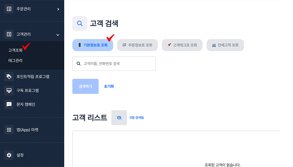 step 2. 검색을 원하는 고객의 이름 및 전화번호를 검색 후 **검색하기** 버튼을 눌러 고객 조회를 진행해주세요.