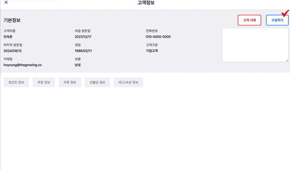 step 3. 고객의 정보를 수정 후 **저장하기** 버튼을 눌러주세요.