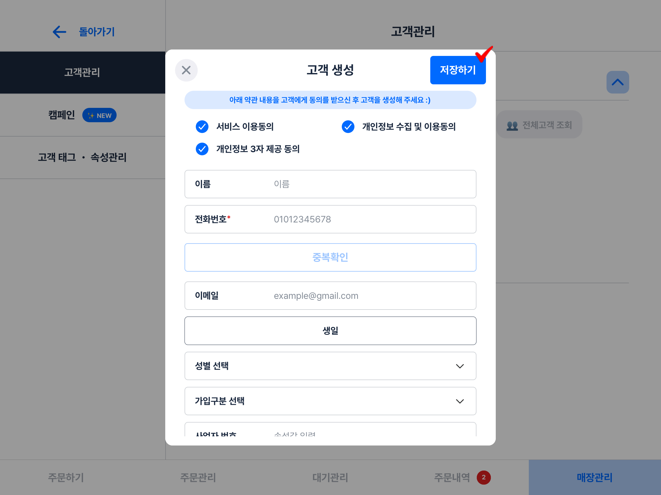 step 2. **고객에게 약관의 동의**를 받으신 후 하단 고객의 정보를 기입하여 **저장하기** 버튼을 눌러주세요.