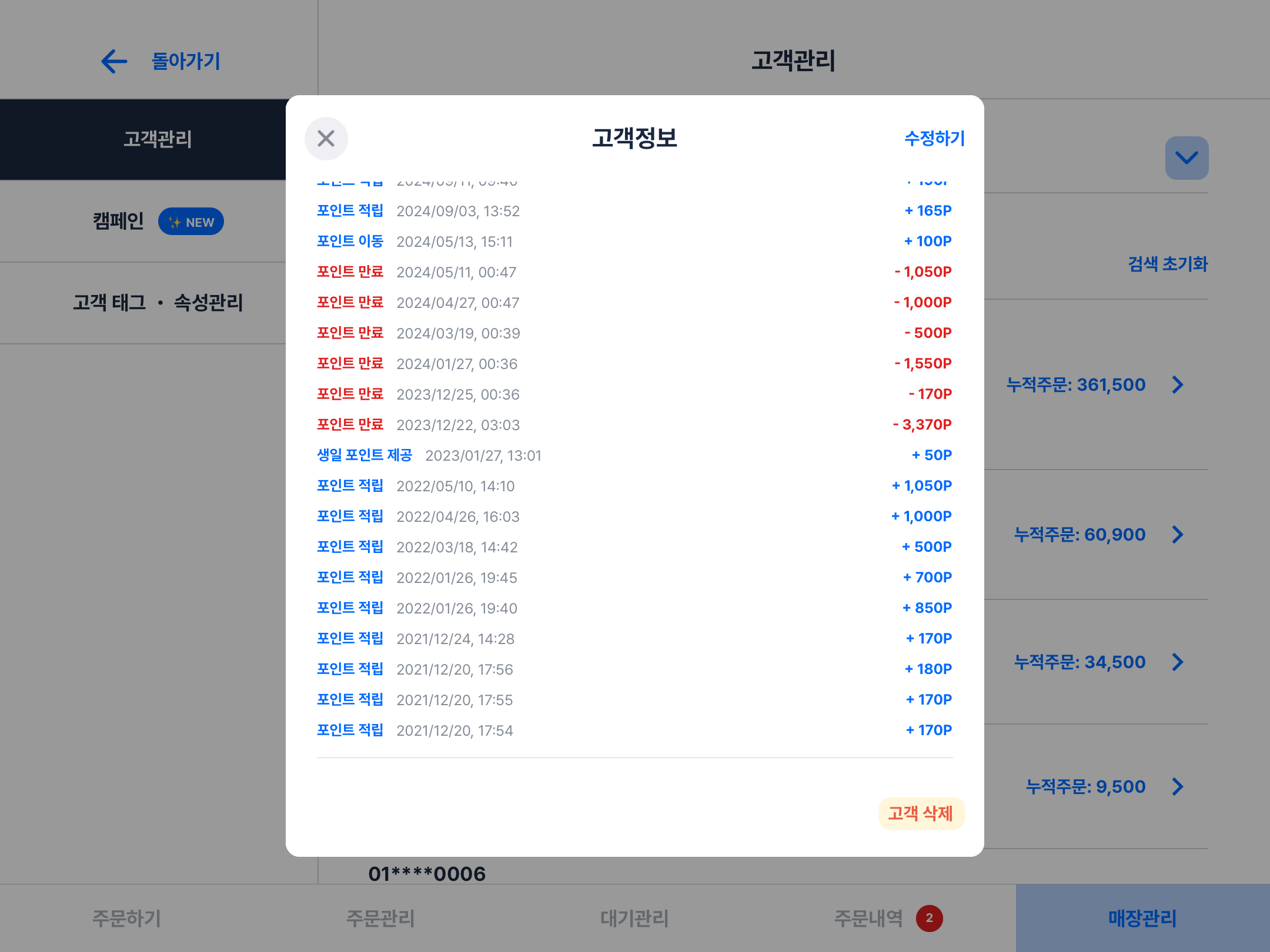 조회된 고객 선택 시 고객의 보유포인트, 누적 주문금액, 최근 주문건 분석결과 등&#x20;