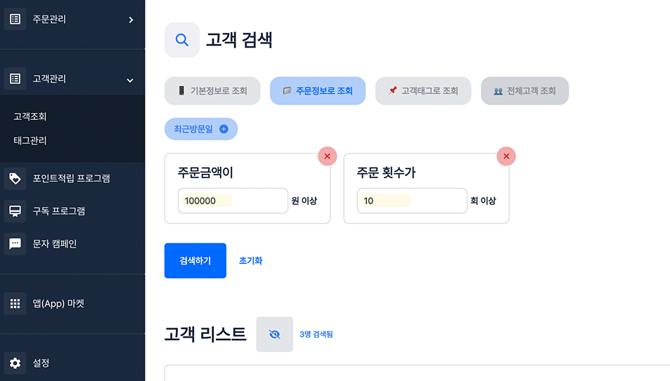 step 2. 원하는 조건을 선택 후 각 **조건에 맞는 숫자를 입력** 후 **검색하기** 버튼을 눌러 고객 조회를 진행해주세요.